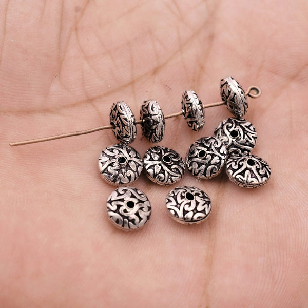 Antique Silver Plated 8mm Floral Print Engraved Saucer Beads