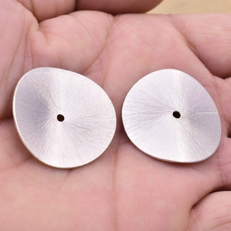 This fine 999 silver plated 30mm wavy disc bead features a potato chips shape that will work in a variety of designs. Its size is just right for the main component on bracelets or earrings, and it would also work well as an accent on necklaces. It displays a shining silver color that will work well with regal color palettes as silver goes with hundreds of color palettes, so don't be afraid to try something new. HURRY NOW...buy at pocket friendly price...!!!