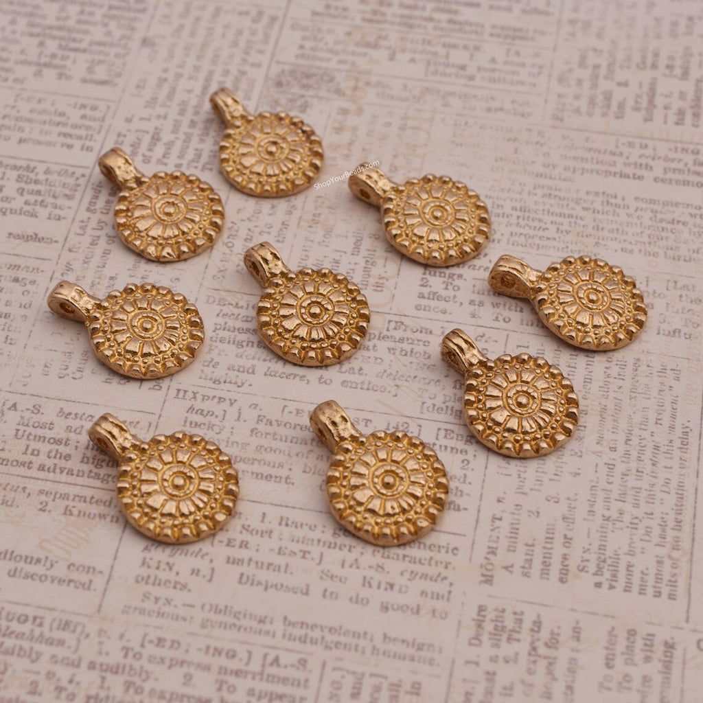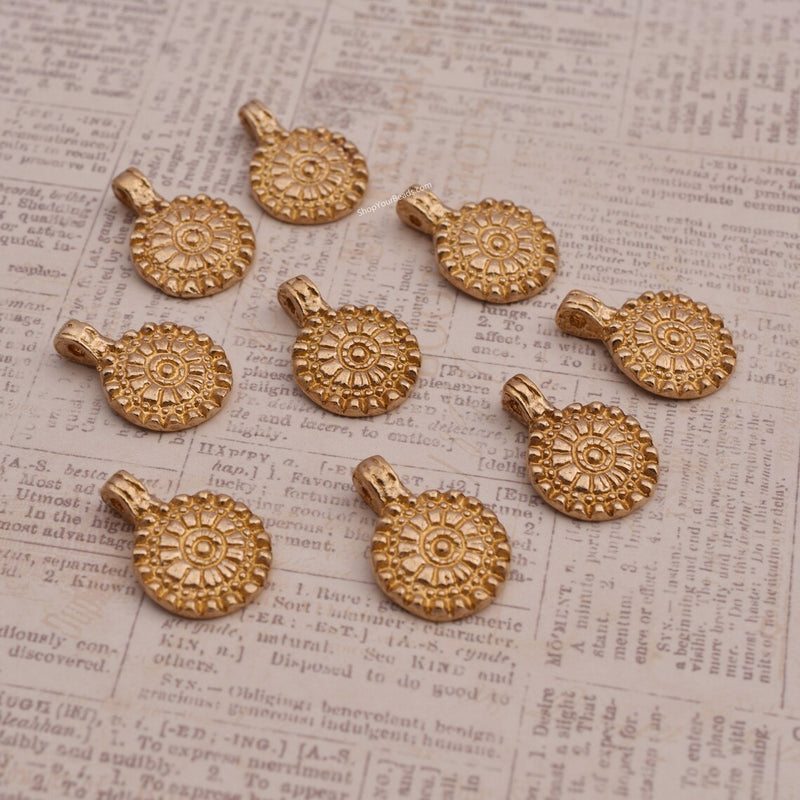 Put floral elements into your designs with 16mm - 10pcs Raw Brass Tribal Charms, Tribal Geometric circular pendants with a flower made on the surface applicable for Jewelry Makings And Macramé. Use it as a cute touch in spring themes, try it in summer looks or girly looks. It's sure to liven up any design. It will work in necklaces, bracelets, and even earrings or can you can create a lot of macramé jewelry designs out of it. You'll love the details on display. The versatile and high-quality raw brass golden shine will work with any color palette.