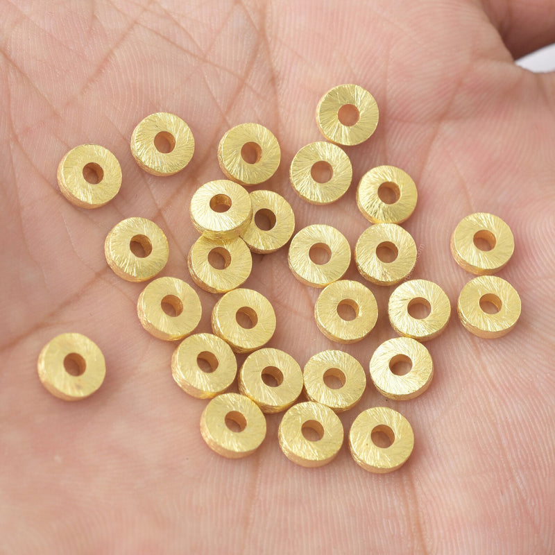 6mm - 25pcs Gold Spacer Beads, Gold Plated Rondelle Beads, Heishi Round Beads, Brushed Finish, Gold Plated Findings. These spacer bead will make a wonderful accent in your jewelry designs. The roundel shape will look great between larger beads, or you can layer several together for a fun effect. It is small in size, so try it in necklaces, bracelets, and earrings. Each one features a brilliant Gold shine that is sure to stand out while complementing your chosen color palette.