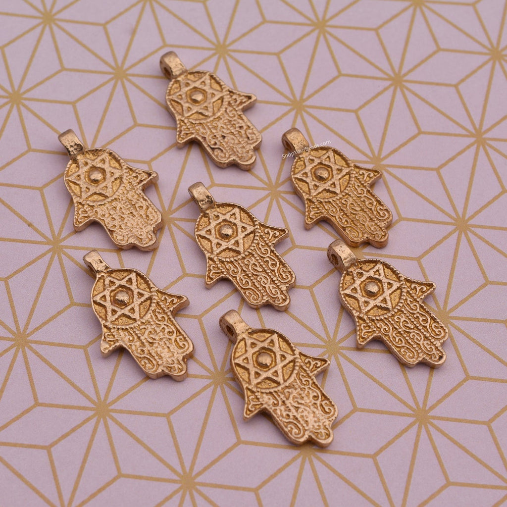 Add a mystical accent to designs with this Raw Brass hamsa hand charms. It is carried like a talisman for evil eye protection and attracting health, fertility, fortune, wealth, and abundance to the owner. Although the more particular hamsa hand meaning can vary from culture to culture. A hole is drilled at the top and bottom of the hand and at the tips of each finger, so you can use this piece as a chandelier or in any designs. It features a versatile raw brass goldy shine that will work with many color palette.