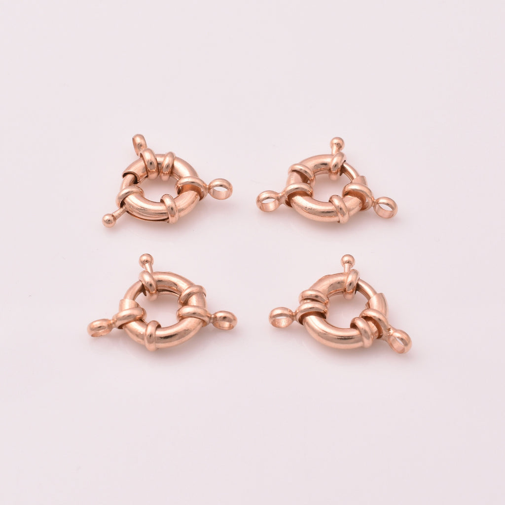 Real Rose Gold Spring Round Clasp, Components For Jewelry Making. This spring clasp is bold in size, so you can use it to finish bold necklaces or chunky bracelet styles. This clasp will fit seamlessly into your designs and provide them with a secure finishing touch. Use this cool clasp to complete multi-strand necklaces, bold bracelets, and more.